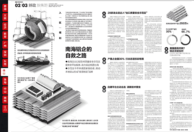 南海區(qū)出口鋁型材質(zhì)量安全示范區(qū)提供全平臺(tái)服務(wù),助力鋁企抱團(tuán)出海。示范區(qū)今年申請(qǐng)國(guó)家級(jí)驗(yàn)收,推動(dòng)本地鋁業(yè)形成“南海制造”品牌。 入“區(qū)”福利 “對(duì)我們的影響?基本沒(méi)有?!睆V東華昌鋁廠副總經(jīng)理武衛(wèi)社語(yǔ)氣平淡。3月底他接受南都記者采訪時(shí),剛剛在手機(jī)上又看了一則新聞,是一則分析美國(guó)對(duì)進(jìn)口鋼、鋁制品征收關(guān)稅的全球影響。