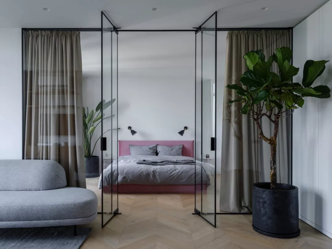 看看《小歡喜》里面宋倩的臥室,就是把整面墻都砸了,換成玻璃門,這樣的話就可以更大面積的促進采光共享,而在晚上睡覺的時候又可以拉上窗簾增加空間的私密性。
