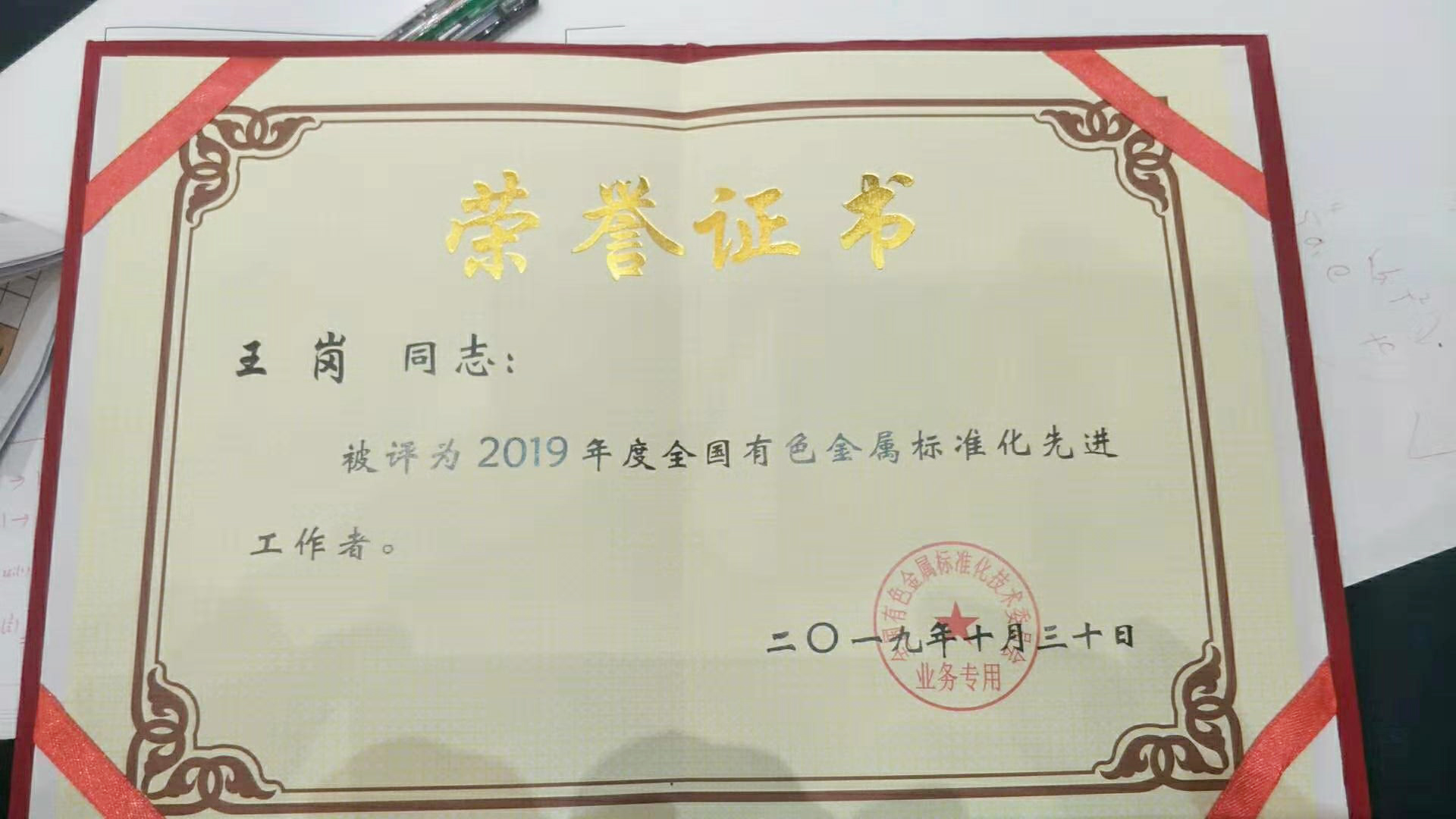 王崗獲得“2019年度有色金屬標(biāo)準(zhǔn)化先進(jìn)工作者”榮譽(yù)稱號(hào)(右二)