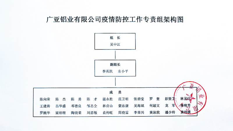 自1月下旬開始,有關(guān)武漢出現(xiàn)疫情的報道就不斷傳來,特別是在1月23日(年二十九)武漢“封城”之后,全國的防疫形勢就一下子緊張起來了。廣亞也在密切關(guān)注形勢發(fā)展,并已預計到可能對復工復產(chǎn)造成的影響。公司隨即成立了由吳中江總裁親自掛帥的疫情防控領(lǐng)導小組。鋁業(yè)事業(yè)部總經(jīng)理李英凱和人力資源部總經(jīng)理左小平任副組長,各部門主要負責人任組員。