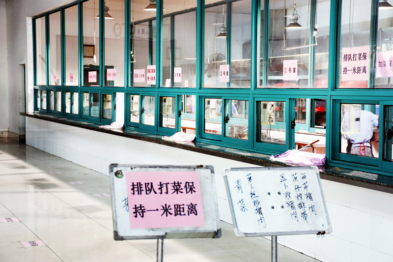 飯?zhí)貌惋嫹矫?,所有采購物質(zhì)在原來安全清潔要求的基礎(chǔ)上,增加了特別的消毒處理,保證來料安全。與此同時,對飯?zhí)镁筒蛥^(qū)進行了重新設(shè)置,原來能坐十人的圓桌現(xiàn)在規(guī)定只坐四人,且四個位置都設(shè)置成對角線位置,保持足夠的距離;原來能坐六人的條桌現(xiàn)在規(guī)定只坐兩人,也按對角線位置設(shè)置。原來員工就餐,打菜是廚房幫打菜,打飯及盛湯由員工自助,現(xiàn)為防交叉感染,所有工作全部由飯?zhí)冒才艑H素撠煛_€對打菜區(qū)劃定了等候區(qū)、緩沖區(qū)等標識,保障相鄰兩個打菜員工之間至少保持有1米的安全距離。