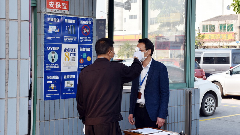 員工入廠時,要求配帶口罩。復工后,口罩由公司提供,每天一只換新。員工在廠門口接受體溫檢測,在填寫《體溫檢測登記表》后,憑工作證和先前已經(jīng)發(fā)放到員工手上的實名臨時出入證方可入廠。每天公司都會安排人力資源部一兩名同事與保安員一道,在大門口協(xié)助員工安全入廠,遇有突出情況,及時協(xié)調(diào)處理。