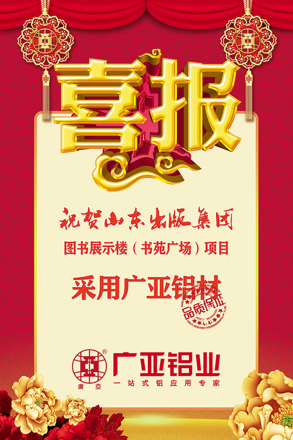 近日,廣亞鋁業(yè)華北大區(qū)傳來喜訊,山東省最大的文化產(chǎn)業(yè)集團(tuán)——山東出版集團(tuán)圖書展示樓(書苑廣場(chǎng))項(xiàng)目幕墻工程采用廣亞鋁材!該項(xiàng)目選用廣亞6063-T5幕墻系列型材,表面處理涵蓋氧化、普通粉末噴涂、氟碳噴涂等多種處理工藝。這是廣亞鋁業(yè)近段時(shí)間,在抗“疫”保增長(zhǎng)的大背景下,逆勢(shì)飛揚(yáng),在山東贏得的又一個(gè)代表性項(xiàng)目。