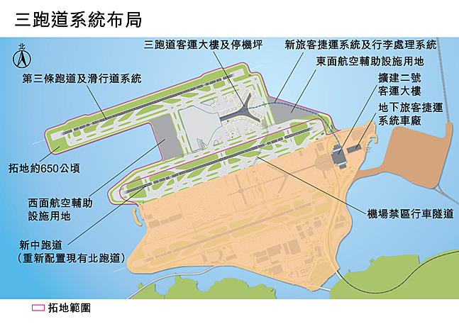 工程包括在現(xiàn)機場北填海拓地約650公頃;興建面積超過28萬平方米的客運大樓,57個停機位及停機坪等。據(jù)機場管理局預(yù)計,新跑道的建成,每年可新增處理客運量達3000萬人次。 客運大樓是該項目的點睛之筆。機場管理局意在將其打造成全球最具效率和最環(huán)保機場雙冠王??瓦\大樓除具備頂級機場通用設(shè)施外,在還大樓中庭設(shè)置庭院,廣植草坪及樹木,為旅客提供恬靜舒適的環(huán)境。