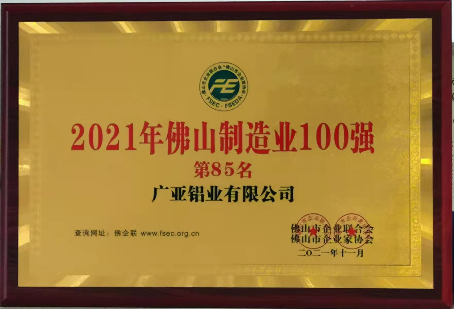 近日,由佛山市企業(yè)聯(lián)合會(huì)、佛山市企業(yè)家協(xié)會(huì)聯(lián)合發(fā)布的《佛山制造業(yè)100強(qiáng)》榜單出爐,作為中國(guó)鋁材行業(yè)的領(lǐng)軍者,廣亞鋁業(yè)憑借雄厚的品牌綜合實(shí)力榮耀登榜。