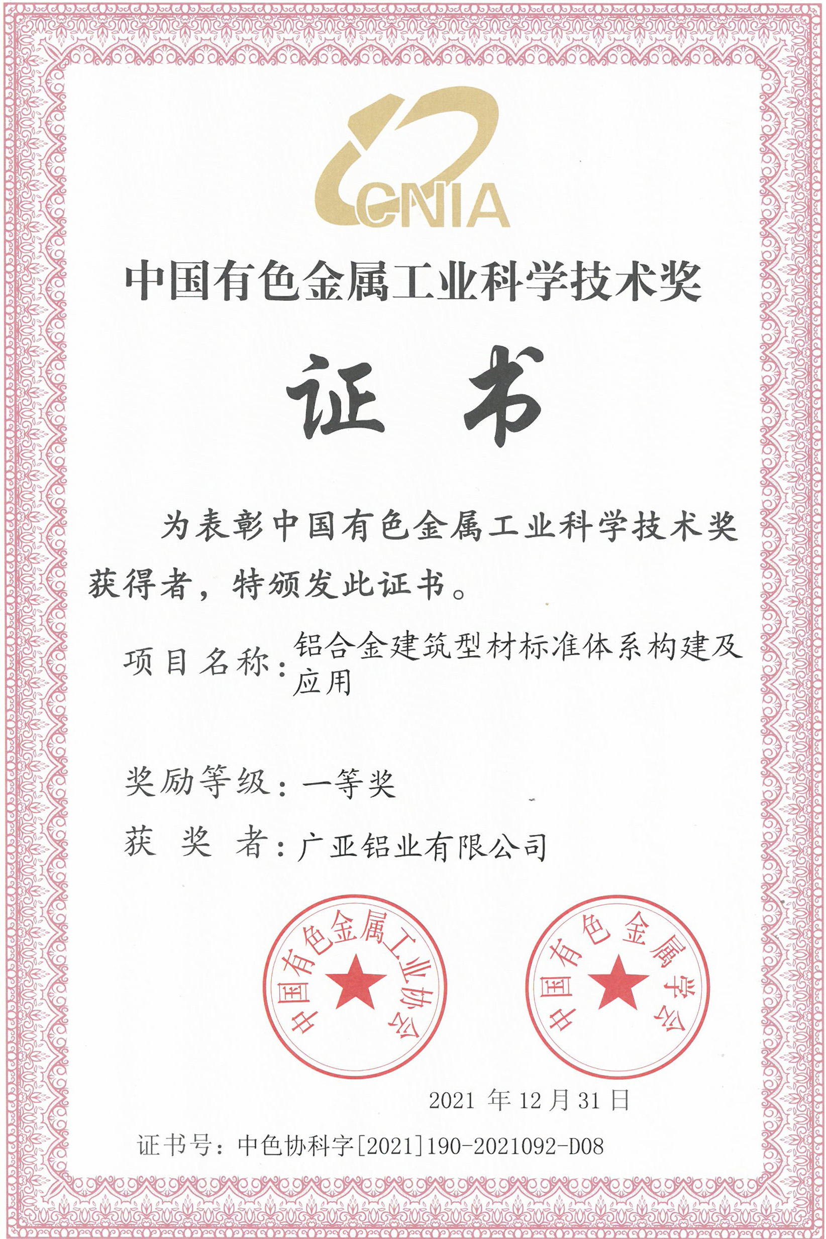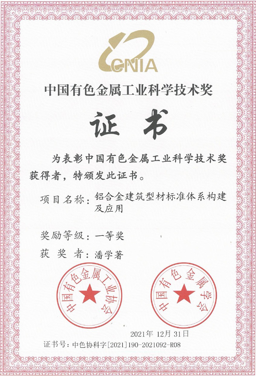 參與攻關(guān)的“鋁合金建筑型材標(biāo)準(zhǔn)體系構(gòu)建及應(yīng)用”項(xiàng)目榮獲中國(guó)有色金屬工業(yè)科學(xué)技術(shù)獎(jiǎng)一等獎(jiǎng)。