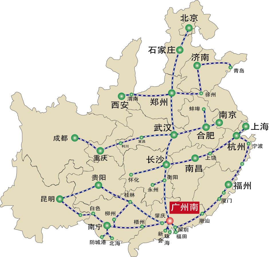廣州南站,東接廣莞惠城際、西連貴廣高鐵、南連廣深港高鐵、北接京廣高鐵,是全國最大的高鐵客運站。
