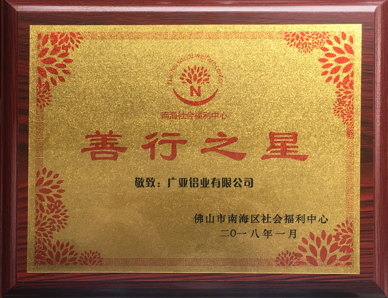 2018年1月20日,不忘初心、義愛同行——2017南海區(qū)社會福利中心愛心嘉許儀式在中心活動廳舉行。廣亞鋁業(yè)作為福利中心星光老年之家愛心連廊捐贈者,及多年一貫的善行義舉獲頒南海區(qū)“善行之星”。